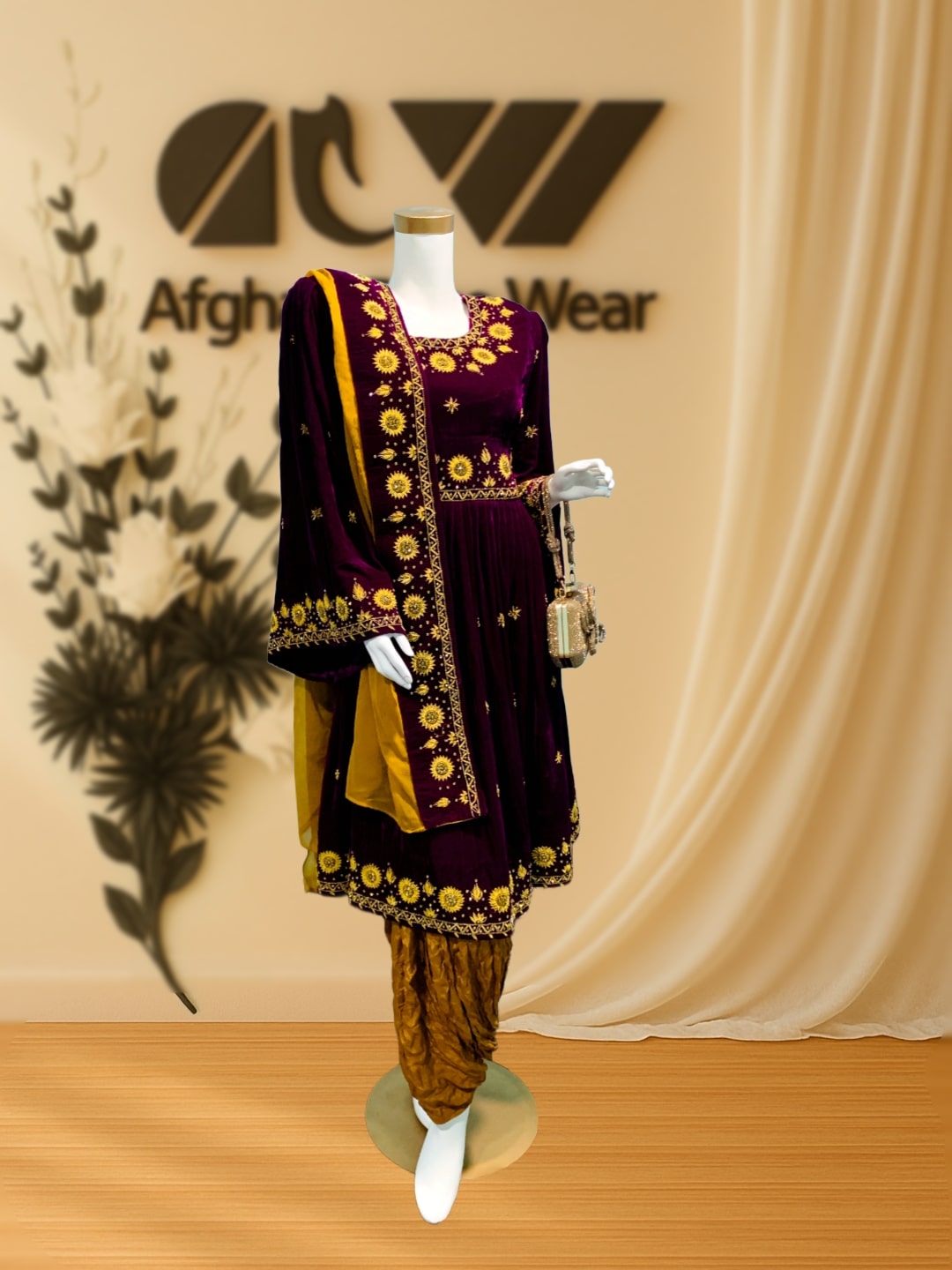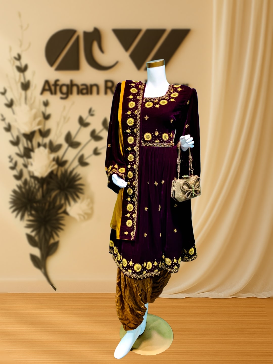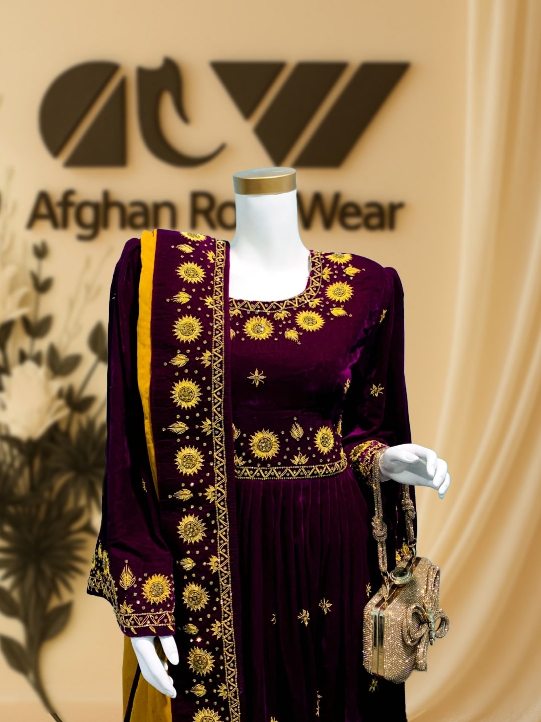 A rich velvet Afghan dress adorned with golden fanar embroidery and gemstone details. Perfect for weddings and cultural events. Comes with a matching golden bag.