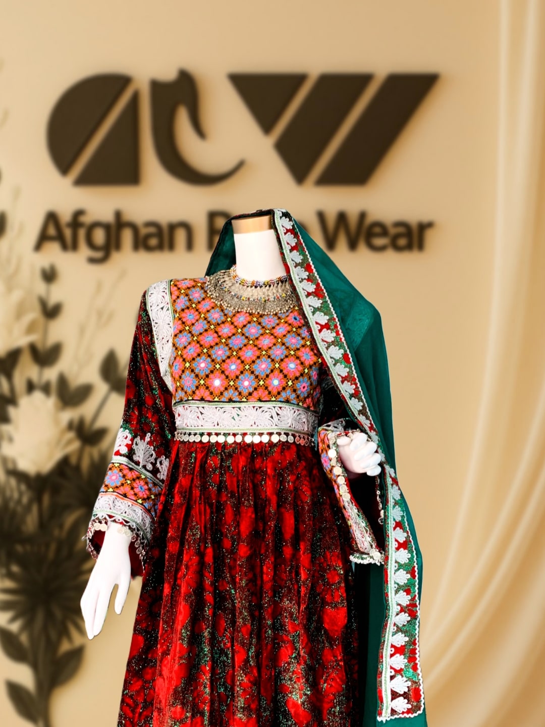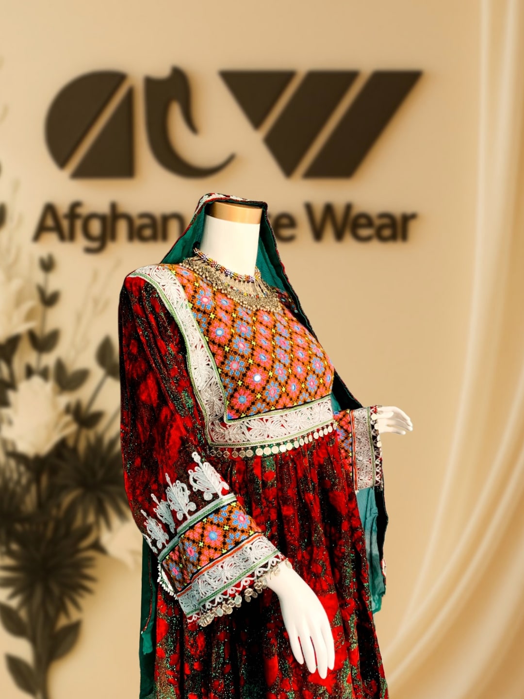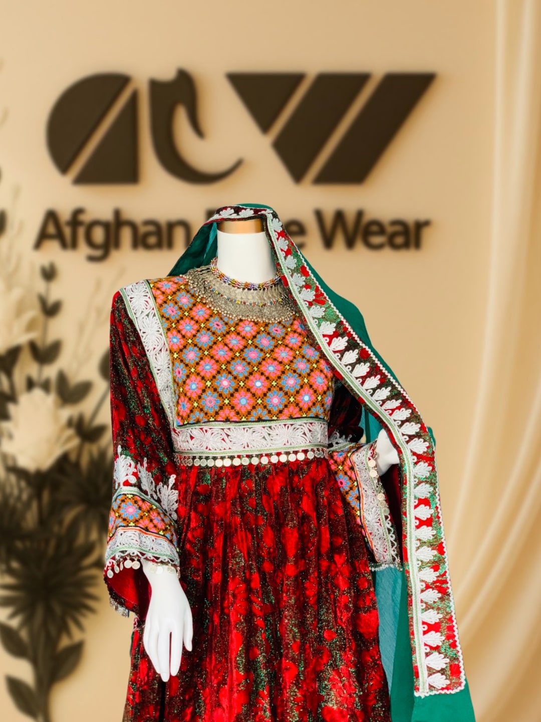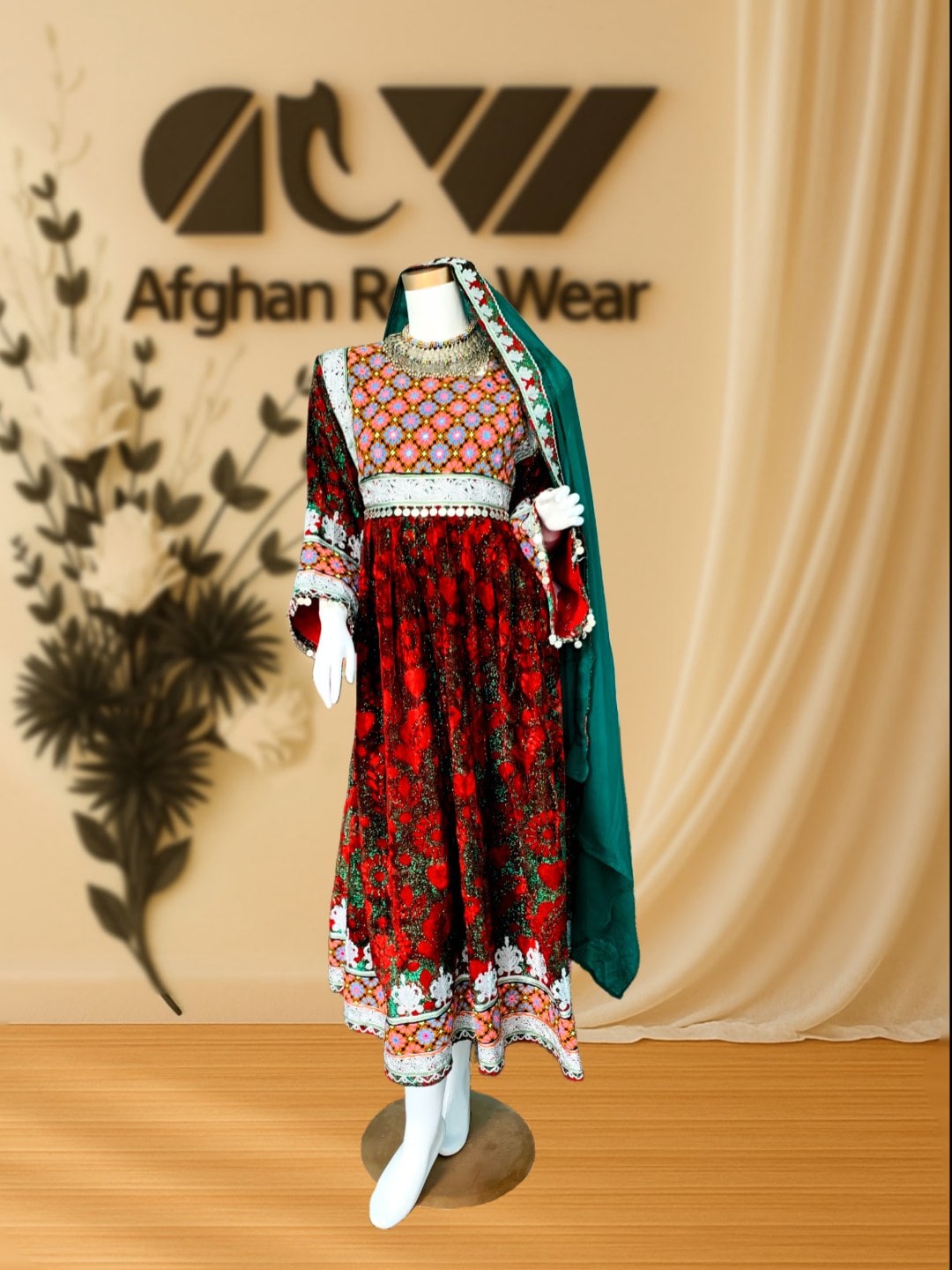 A beautifully handcrafted Afghan dress with vibrant embroidery, mirror work, and intricate lace detailing. Made for cultural events, weddings, and special occasions. Includes a matching scarf.